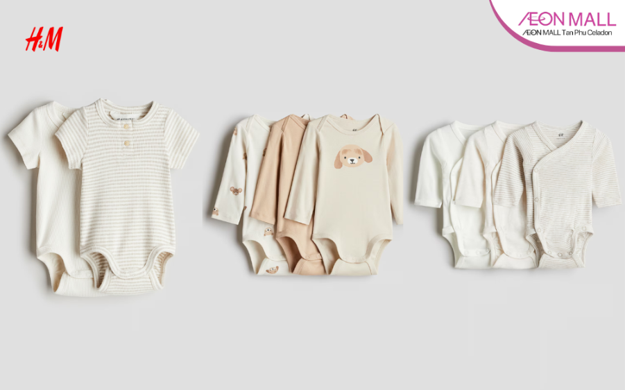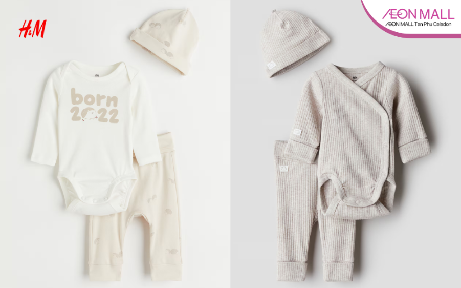 Dòng sản phẩm H&M Baby mang đến sự lựa chọn hiện đại với phong cách Bắc Âu tối giản. Các sản phẩm trong bộ sưu tập đồ em bé sơ sinh tại đây thường sử dụng chất liệu hữu cơ, an toàn với da nhạy cảm. Ba mẹ có thể chọn các mẫu áo liền thân, quần body, mũ, vớ… được phối màu trang nhã, phù hợp cả bé trai lẫn bé gái. Cửa hàng tại AEON MALL Tân Phú Celadon thường xuyên cập nhật hàng mới, và có khu vực phân chia rõ ràng giúp ba mẹ dễ dàng chọn mua theo từng độ tuổi.