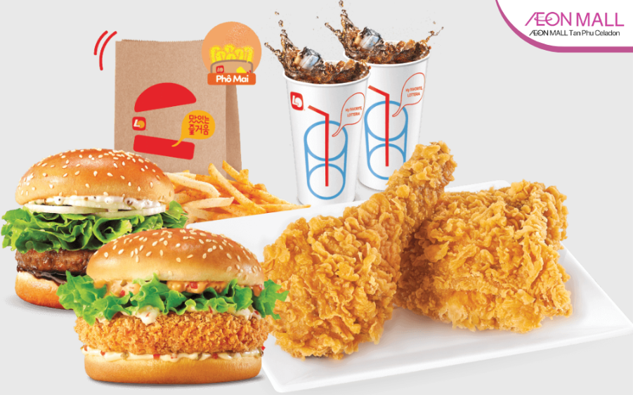 Không chỉ có gà rán, Lotteriatại AEON MALL Tân Phú Celadoncòn phục vụ các món burger, mì Ý, khoai tây chiên, cơm... giúp cả gia đình có thêm nhiều lựa chọn đa dạng cho bữa tối Trung thu.Không gian tại đây cũng rất ấm cúng, bàn ghế bo tròn góc và sắp xếp hợp lý.Thích hợp cho các gia đình có trẻ nhỏ dùng bữa thoải mái.