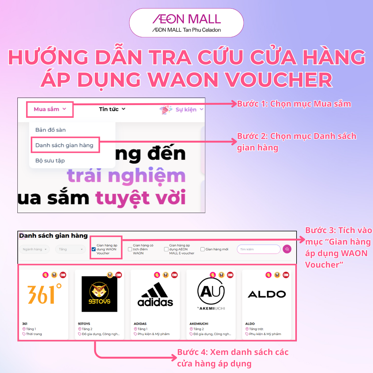 Để tra cứu danh sách cửa hàng áp dụng Waon Voucher tại AEON MALL Tân Phú Celadon bạn có thể thực hiện như sau:
