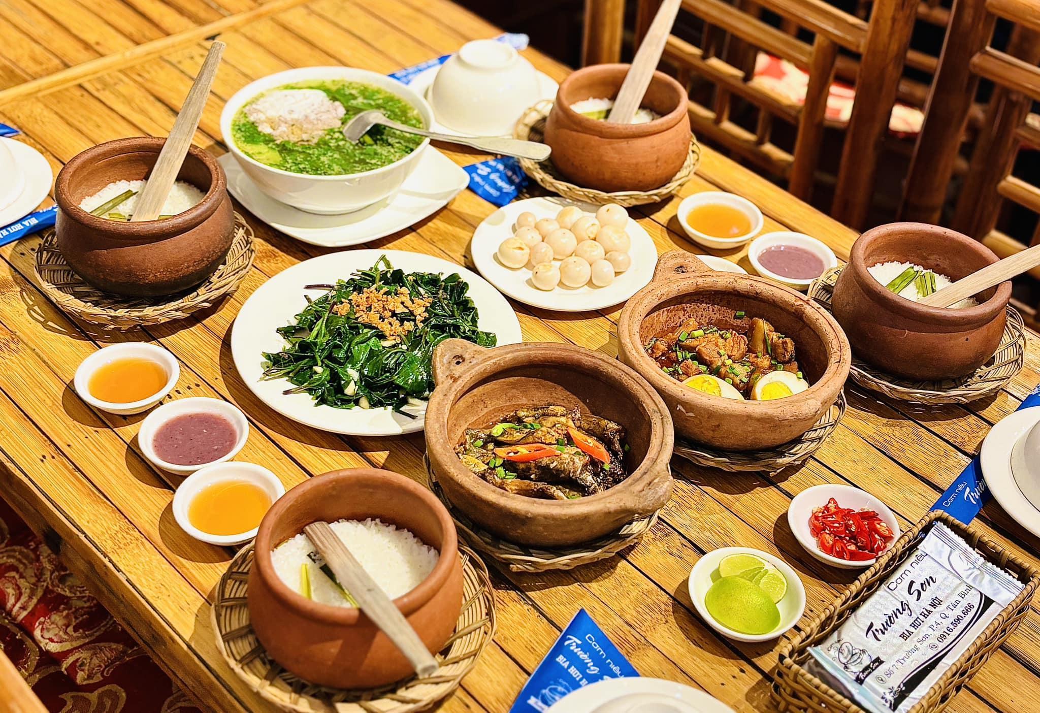 Nằm ngay khu vực cửa ngõ sân bay Tân Sơn Nhất, Cơm Niêu Trường Sơn là điểm dừng chân lý tưởng cho thực khách muốn tìm lại hương vị cơm nhà thuần túy giữa lòng phố thị sầm uất. Nhà hàng gây ấn tượng bởi không gian mộc mạc, sử dụng chất liệu tre gỗ gần gũi và thực đơn đậm chất Bắc bộ. Tại đây, niêu cơm được chăm chút kỹ lưỡng để đạt độ dẻo thơm với lớp cháy vàng giòn, kết hợp cùng các món ăn dân dã tạo nên một bữa ăn ấm cúng và trọn vẹn.
