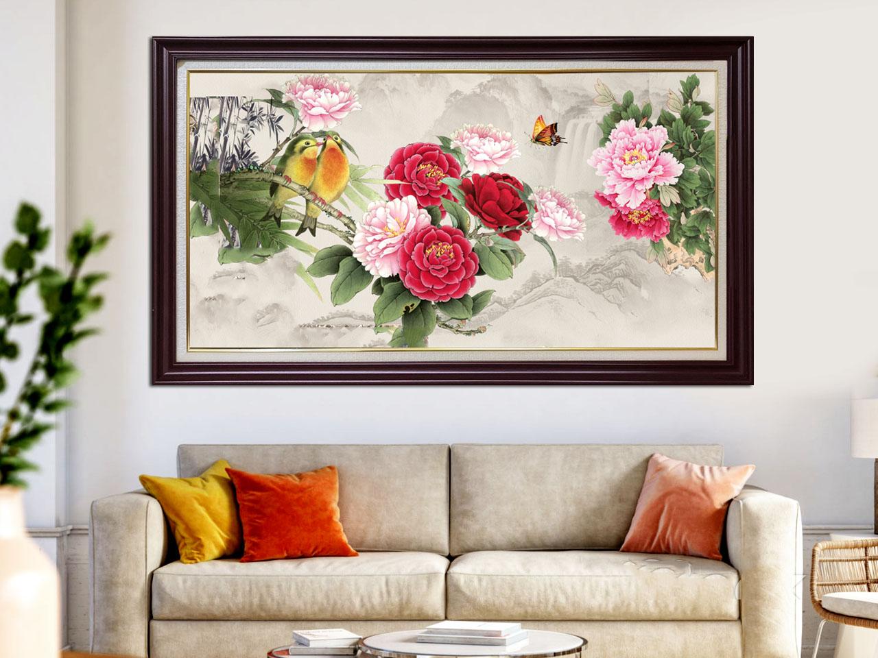 Tranh song hỷ với chữ “hỷ” đôi là biểu tượng quen thuộc của hạnh phúc lứa đôi, thường hiện diện trong các lễ cưới truyền thống Á Đông. Bên cạnh đó, tranh hoa mẫu đơn cũng đại diện cho sự phú quý, sung túc và đời sống hôn nhân viên mãn. Cả hai dòng tranh này đều mang ý nghĩa cát lành, phù hợp làm quà tặng để bài trí trong phòng khách hoặc phòng ngủ của các cặp vợ chồng mới cưới.