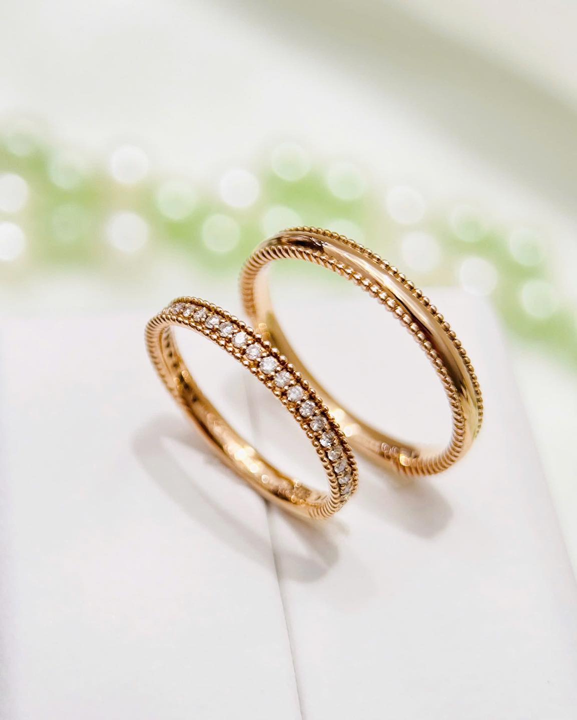 Gợi ý: Hãy thử mix nhẫn cưới mảnh với các nhẫn phụ đính đá nhỏ để tạo hiệu ứng sáng tinh tế.